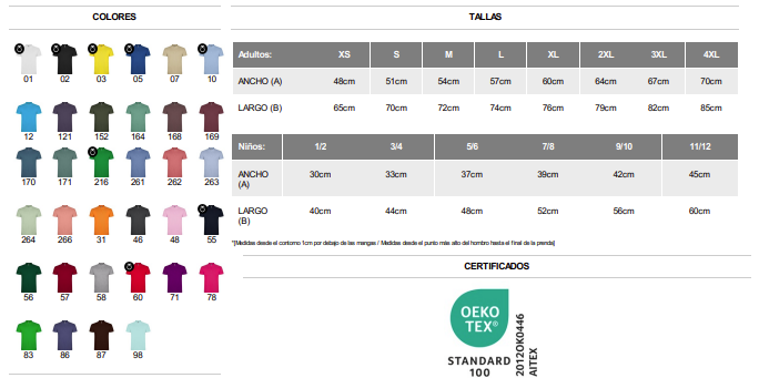 100% algodón, punto piqué, 200 g/m². Color gris vigoré 58: 85% algodón, 15% viscosa.